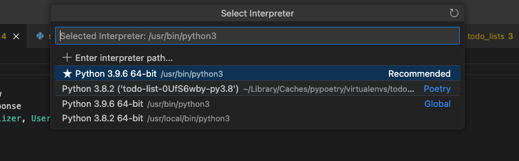 인터프리터 이 부분을 두번째 3.8.2 Poetry 로 바꿔주니 문제가 해결되었다 ^^